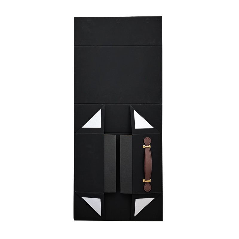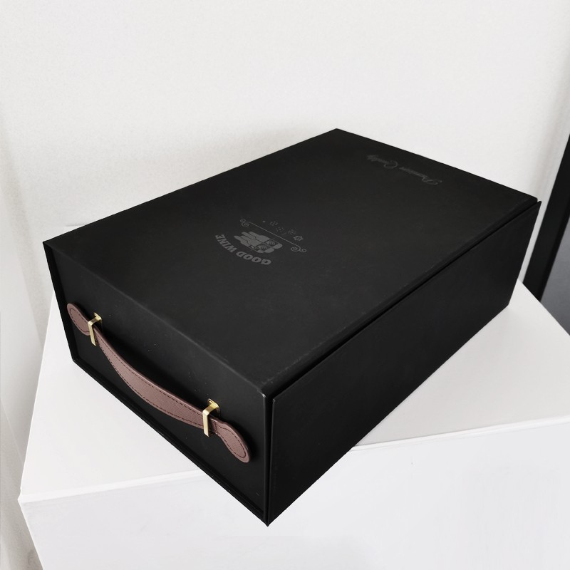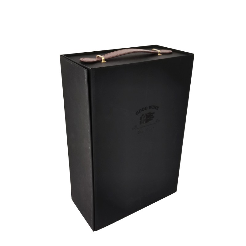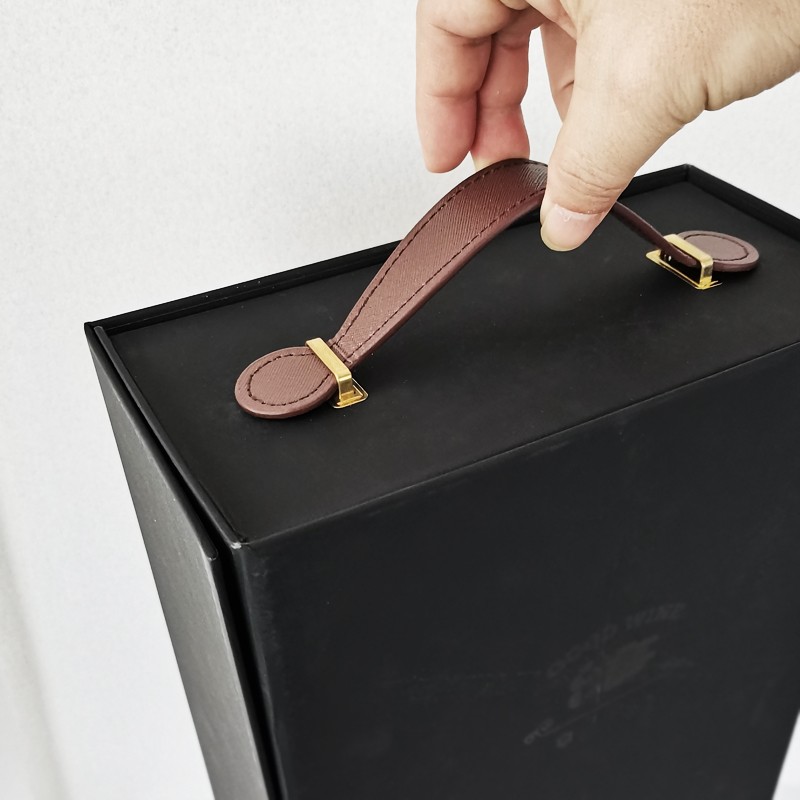 这是一款采用一片式结构设计的高档双瓶装手提酒盒,甄选质感材质打造,外观简约大气且质感高级,配备精致皮质手提带(搭配金属装饰件),开合便捷且内部适配双瓶酒水尺寸,能稳固保护瓶身,兼具轻奢质感与实用便携性,适配白酒、红酒等双瓶酒水的高端包装、送礼或收纳场景。