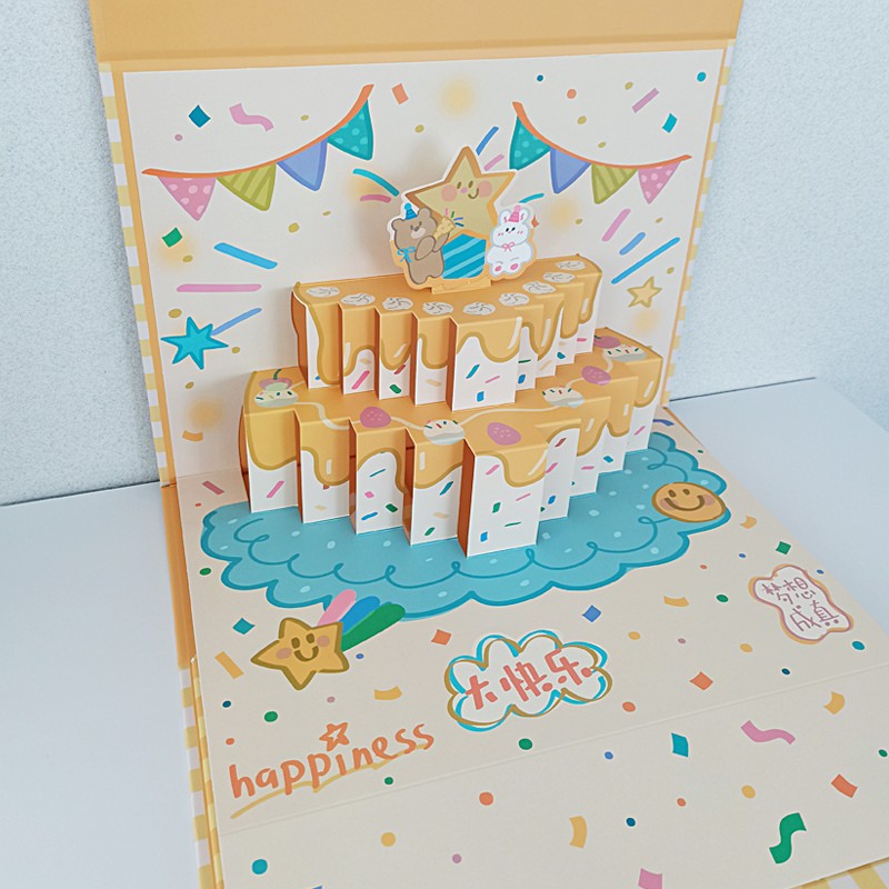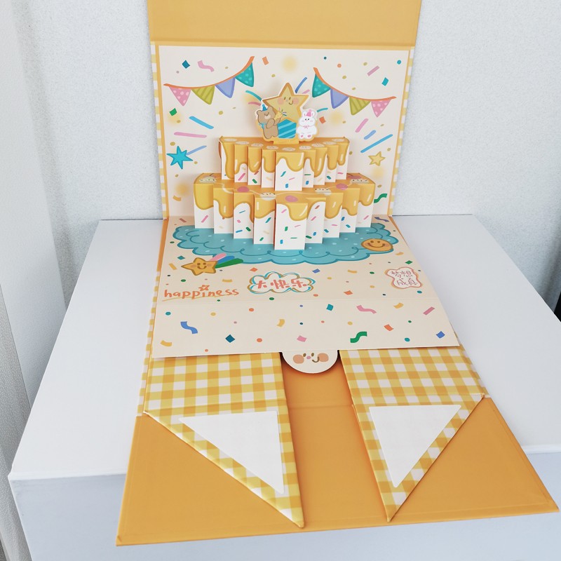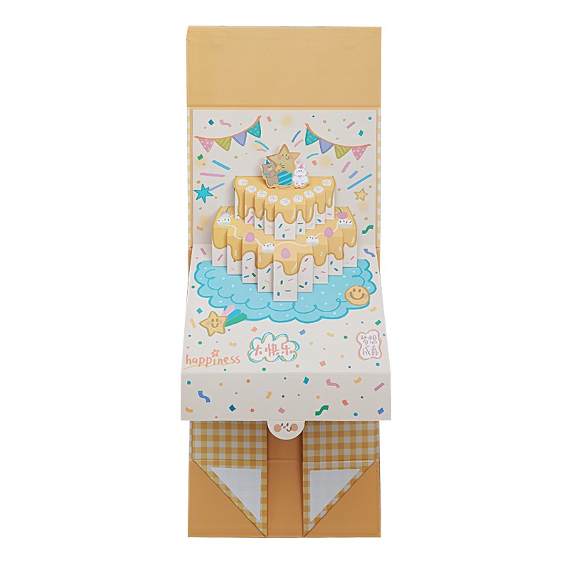 This 3D gift folding box is made of high-quality cardboard, foldable for easy storage, and unfolds to reveal an exquisite 3D scene (such as a birthday cake or party decorations). It combines storage and surprise display functions. The box can be customized with cartoon patterns, brand logos, or greetings, making it ideal for birthday gifts, holiday presents, blind box packaging, and more, enhancing the gift's sense of ceremony and brand recognition.